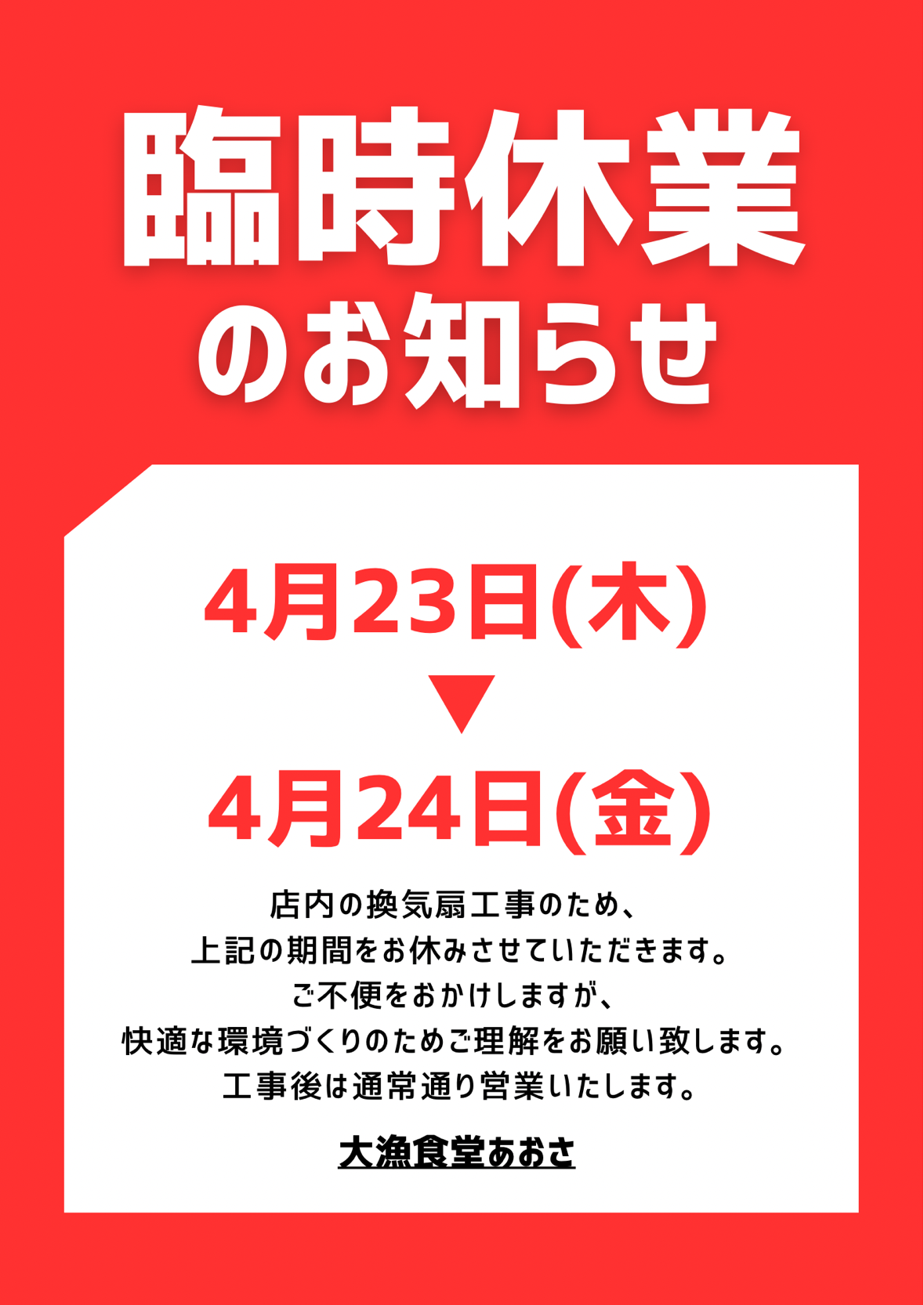 店内の改修工事の為、営業をお休みさせていただきます。